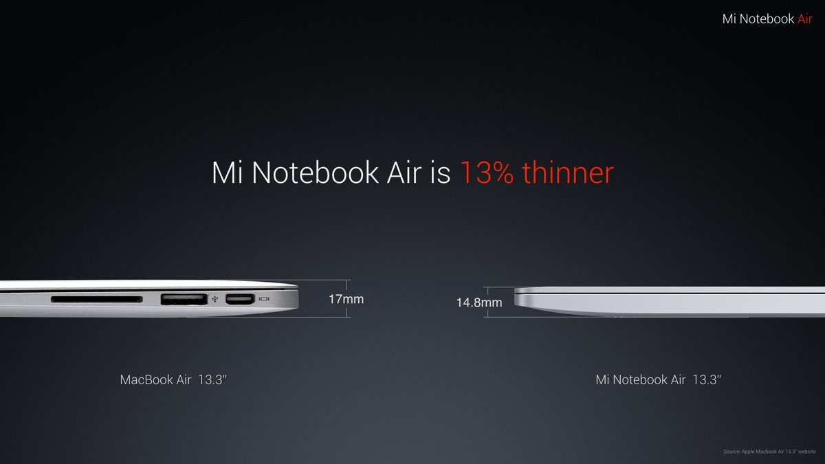 Full HD-экран с диагональю 13,3 дюйма, процессор i5-6200U с частотой 2,7 ГГц, 8 ГБ оперативной памяти, дискретный графический ускоритель GeForce 940MX, SSD-накопитель объёмом 256 ГБ и, что вполне ожидаемо, Windows 10 в качестве операционной системы. Xiaomi заостряет внимание потенциальных покупателей на том моменте, что Mi Notebook Air при той же диагонали экрана на 13% тоньше MacBook Air и на 11% меньше его в плане общего размера. Весит цельнометаллическая малютка немного больше лэптопа Apple — 1,28 килограмма, зато на одном заряде аккумулятора ноутбук способен работать до 9,5 часов кряду. Благодаря наличию разъёма USB Type-C, зарядить аккумулятор до отметки в 50% можно всего лишь за полчаса.